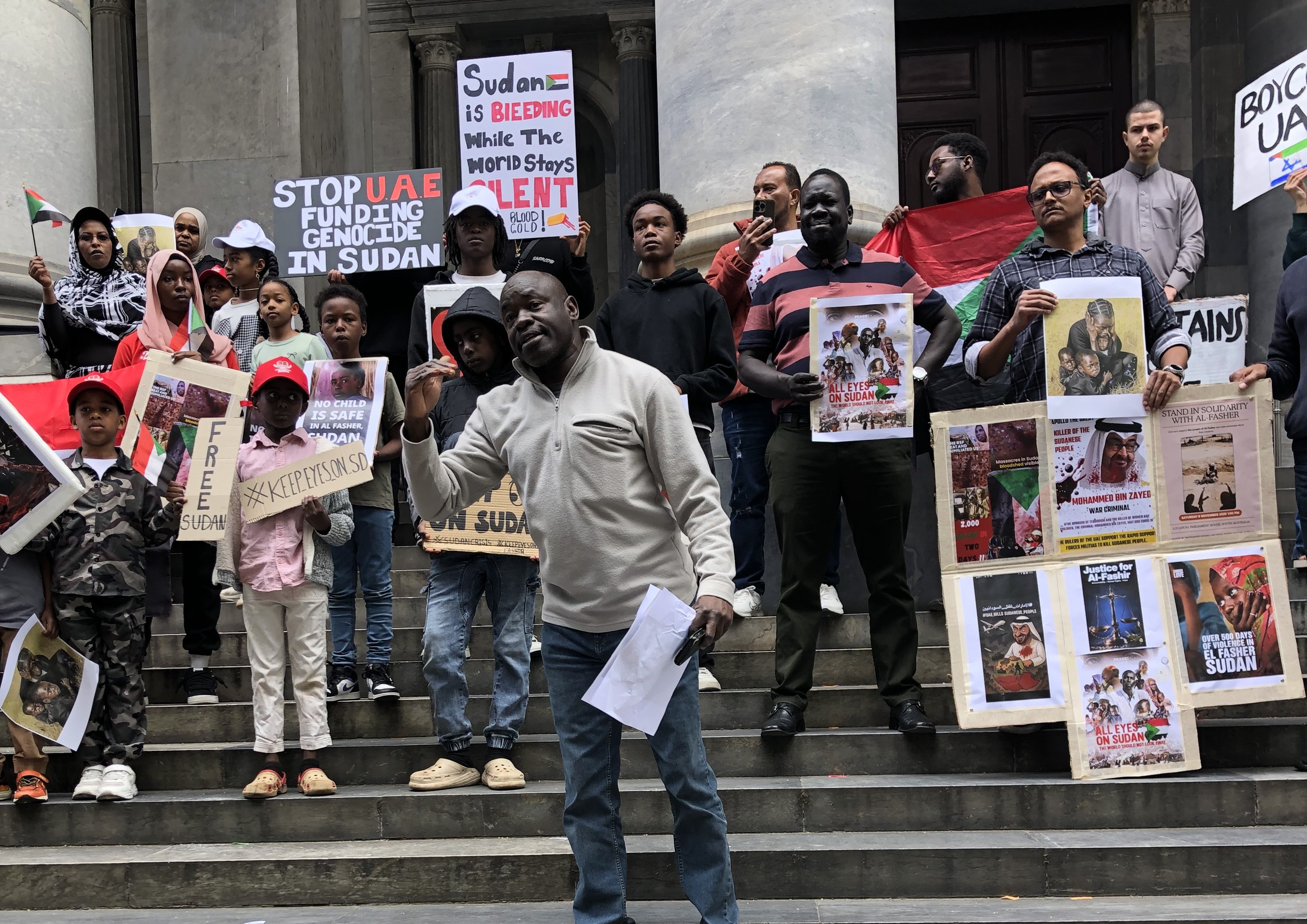 The rally was organised by Ibrahim Eldeen and Sudanese community representatives, who called for freedom for Sudan, a boycott of the United Arab Emirates (UAE) and for Janjaweed militias be held to account at the International Criminal Court.