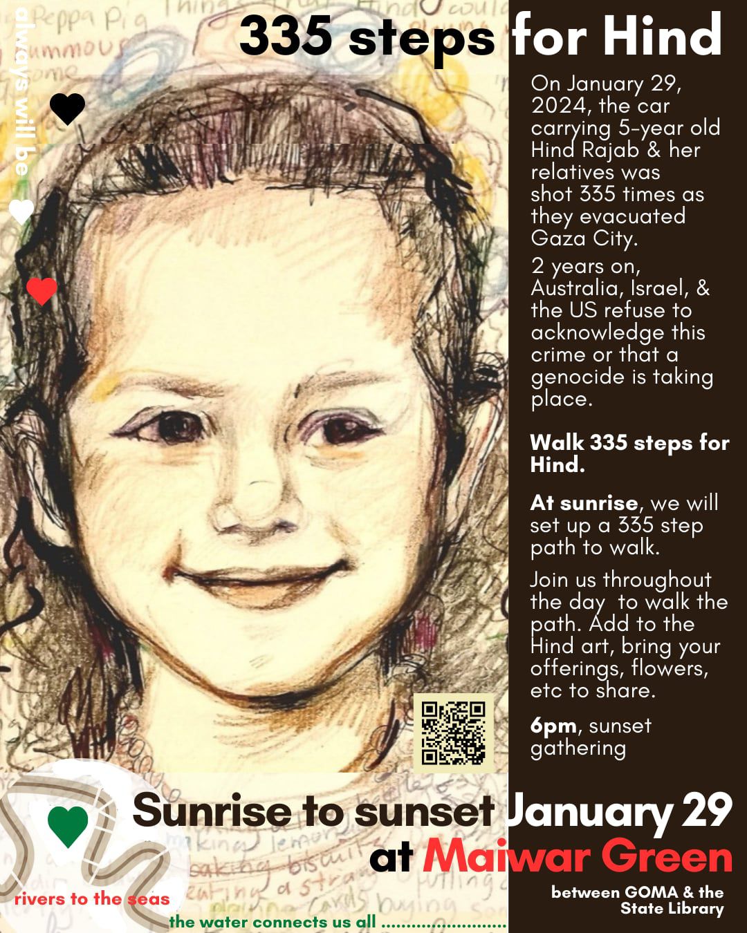 We will take 335 steps for Hind along the Maiwar Green (between GOMA and the State Library, South Brisbane). Community members are invited to come out and join at any point through the day, from sunrise to sunset.
