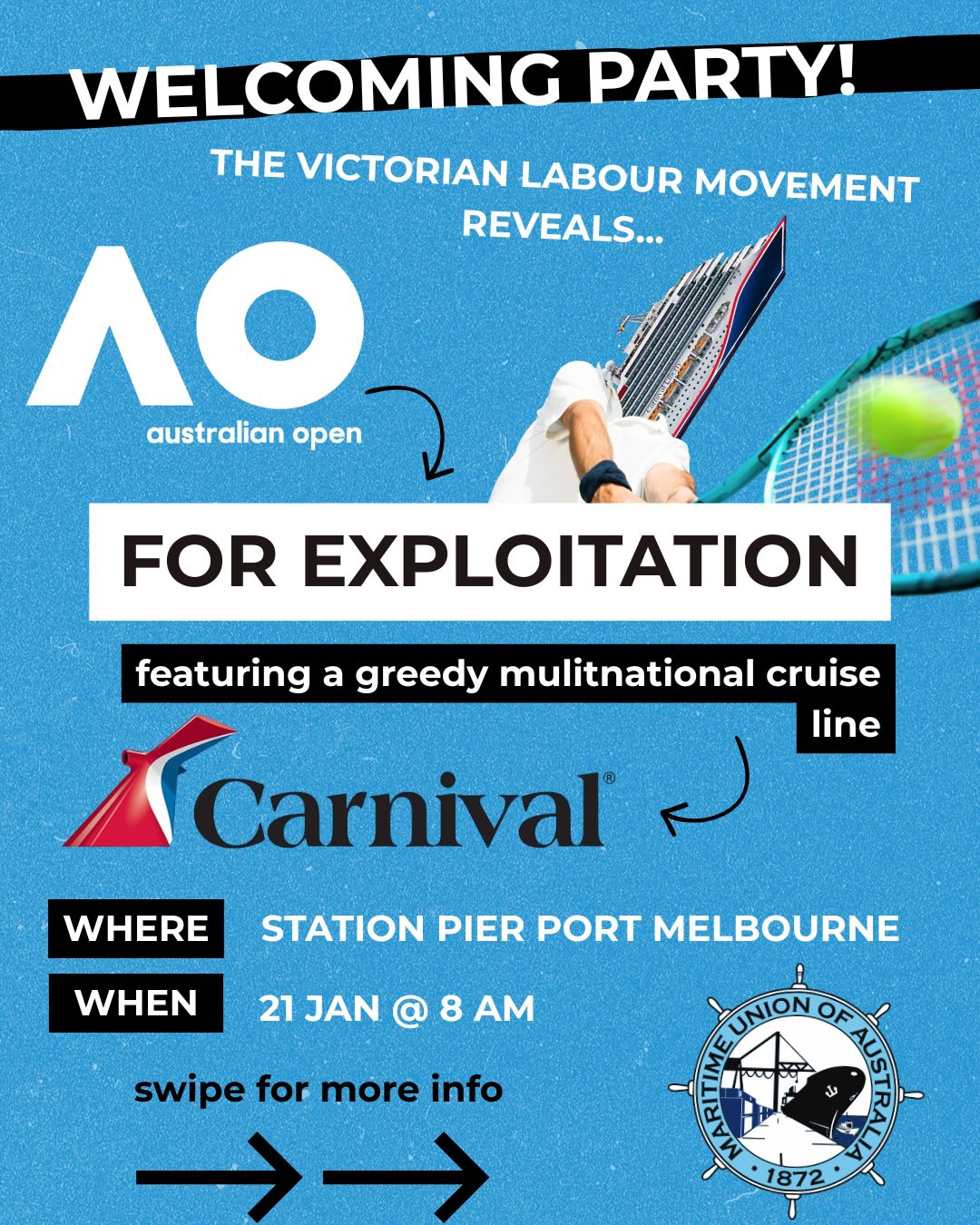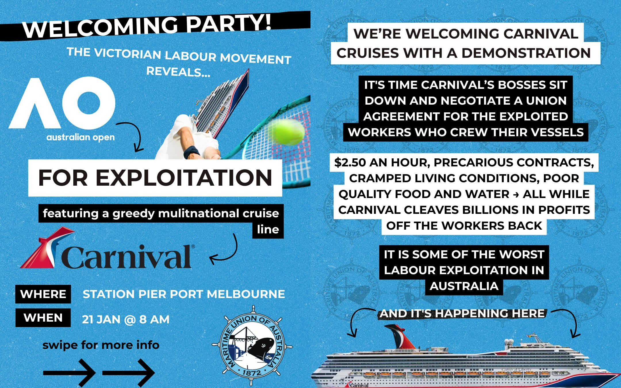 At 8am Wednesday, Carnival Cruises is sailing into Melbourne for the Australian Open, and we're going to be there to give them the welcome they deserve.