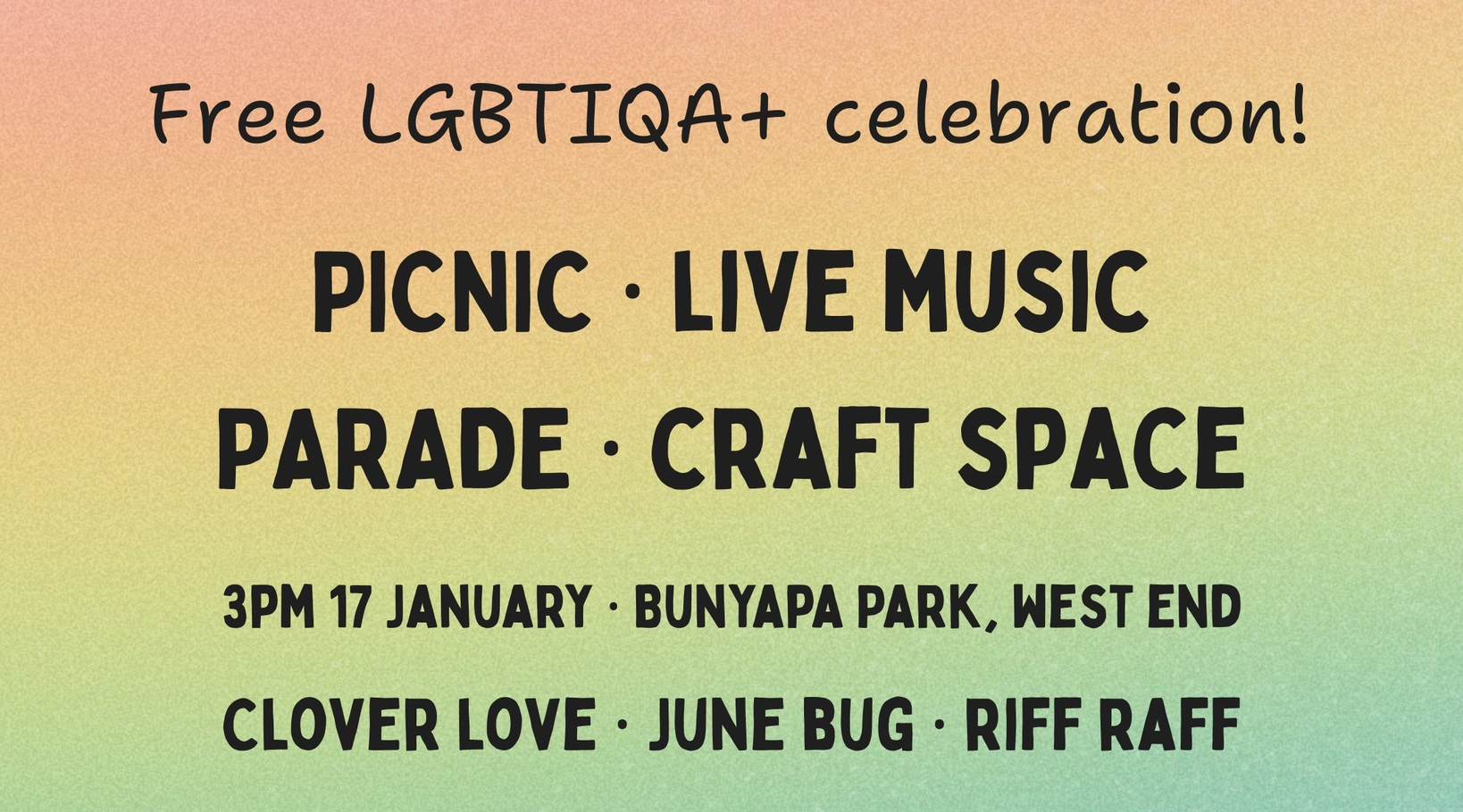 Join us for live music from queer artists and a family-friendly picnic in Bunyapa Park. Then join our parade back to West End Uniting Church where we’ll be holding an LGBTIQA+ arts & crafts space.