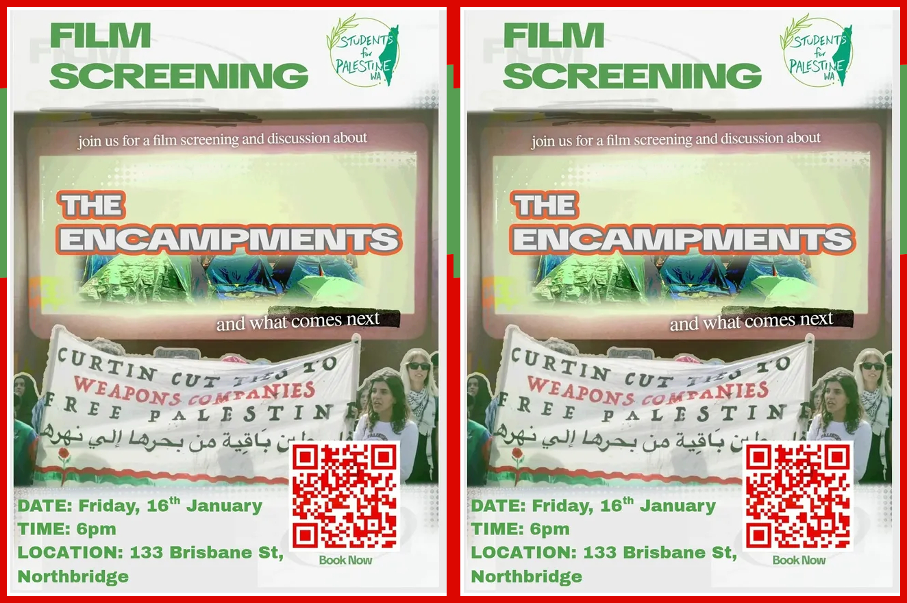 We can now confirm the location of our film screening of 'The Encampments' is at 133 Brisbane St, Northbridge!