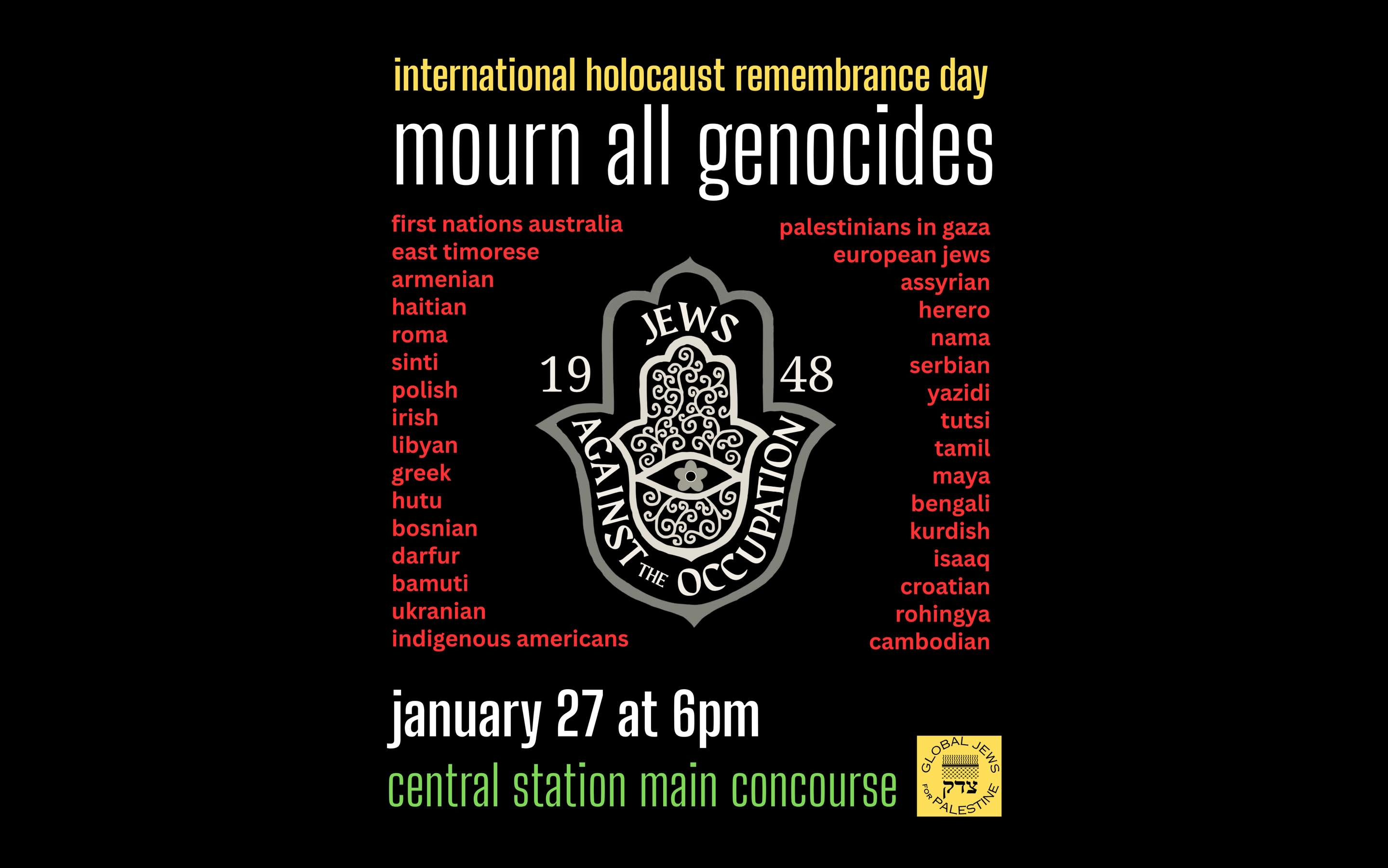 On Tuesday 27th January Jews Against the Occupation '48 will be holding a quiet vigil for all people killed by genocide. We will mark Holocaust Remembrance Day.