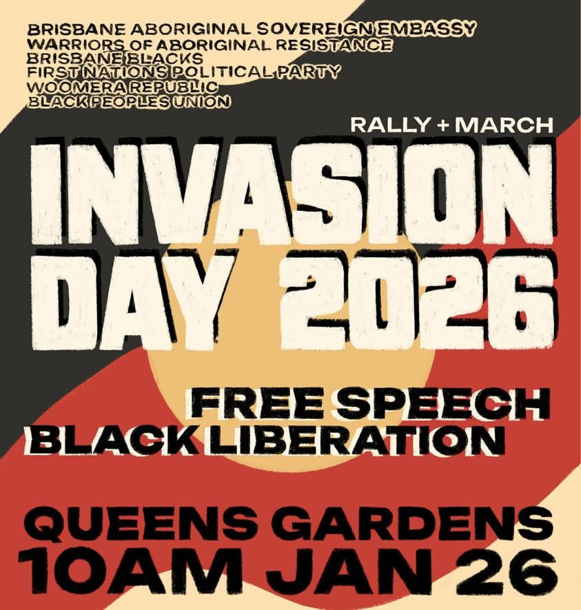 As the 26th of January approaches again, The Brisbane sovereign embassy, Warriors of Aboriginal Resistance, Treatybeforesports, Brisbane Blacks, Black Peoples Union, First Nations Political Party, and Woomera Republic invite all people to commemorate the invasion of this continent, March together and stand against colonial regimes in the heart of this states occupational stronghold.
