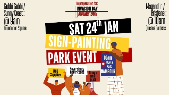 Come join us for a community sign painting gathering on Gubbi Gubbi/Kabi Kabi Country at Quota Park in Nambour at 10am. This gathering is in preparation for the 2026 Invasion Day rallies in both Gubbi Gubbi/Kabi Kabi Country (Sunshine Coast) and Magandjin (Brisbane).