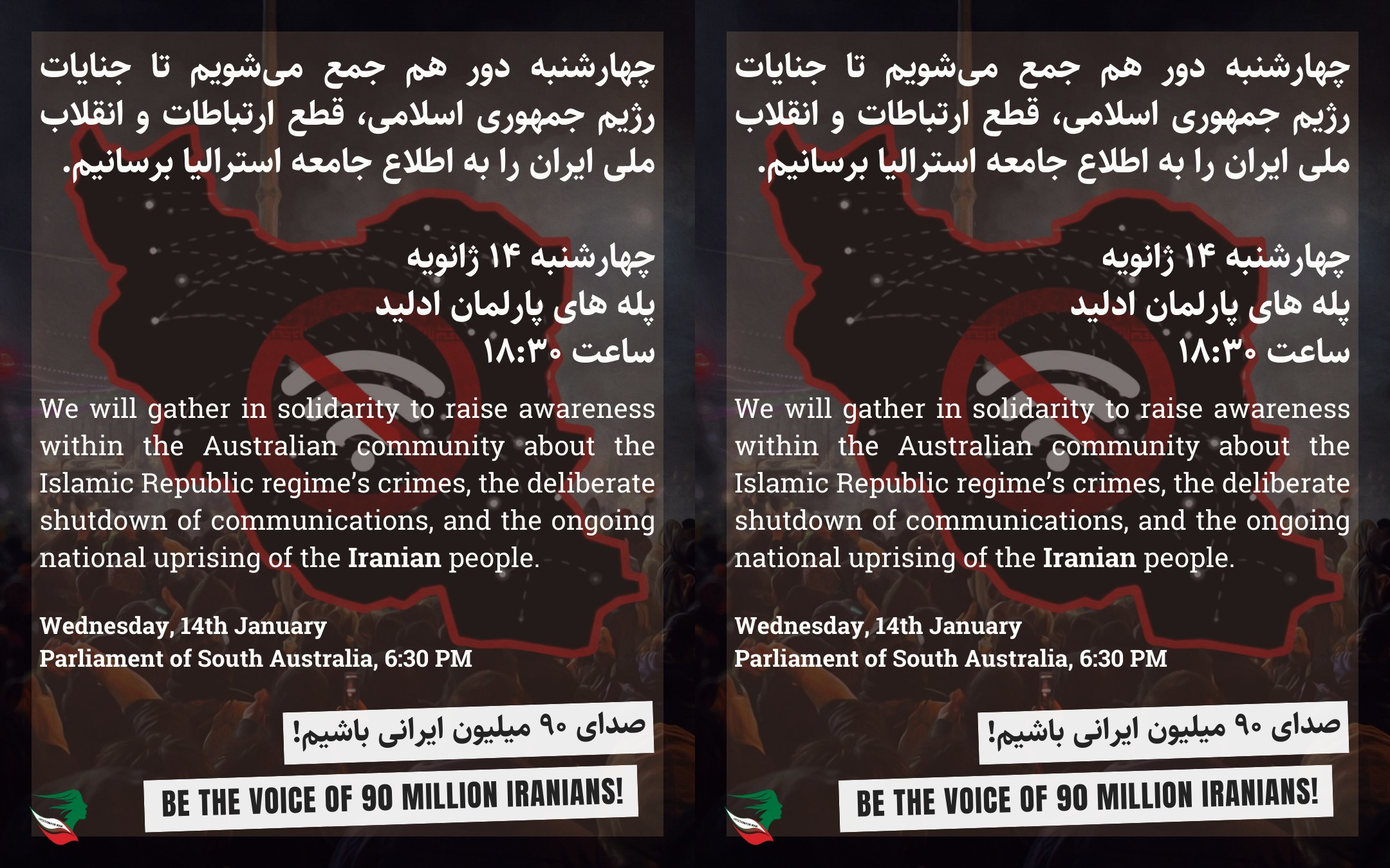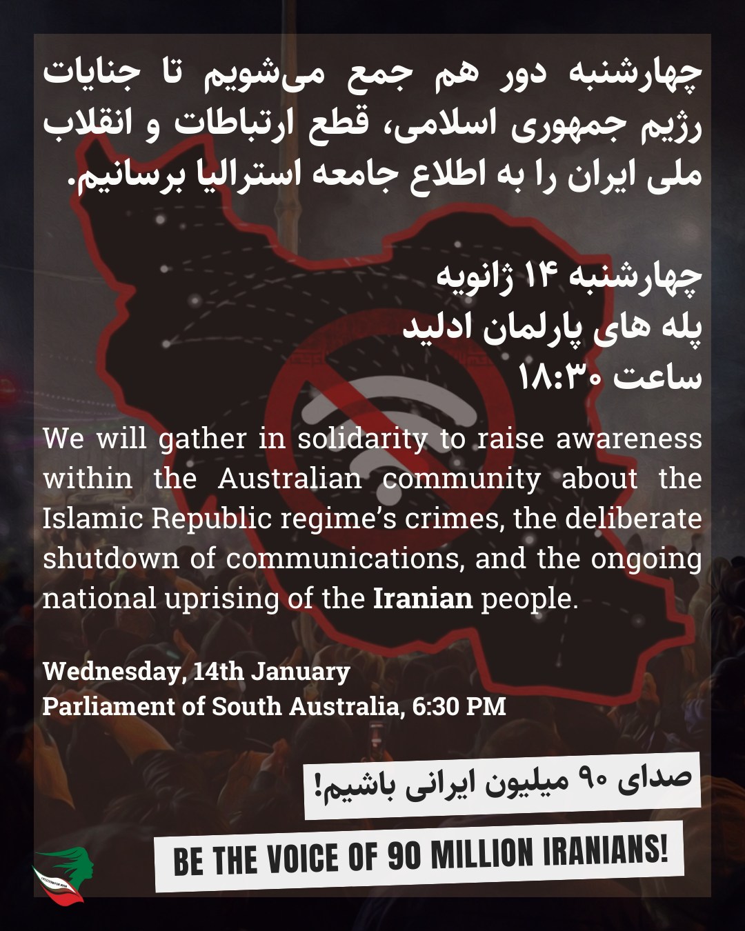 We will gather in solidarity to raise awareness within the Australian community about the Islamic Republic regime’s crimes, the deliberate shutdown of communications, and the ongoing national uprising of the Iranian people.
