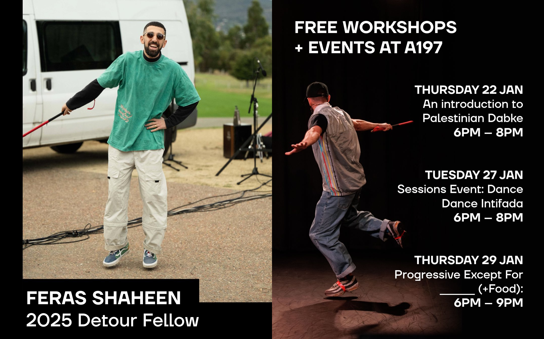 All events are free! Register at tasdance.com.au/feras-workshops.
