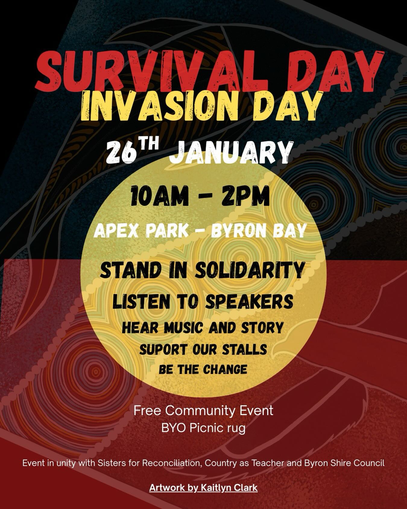 Join Sisters for Reconciliation, Country As Teacher and Byron Shire Council on Monday 26 January for music, speeches, stalls and more.
