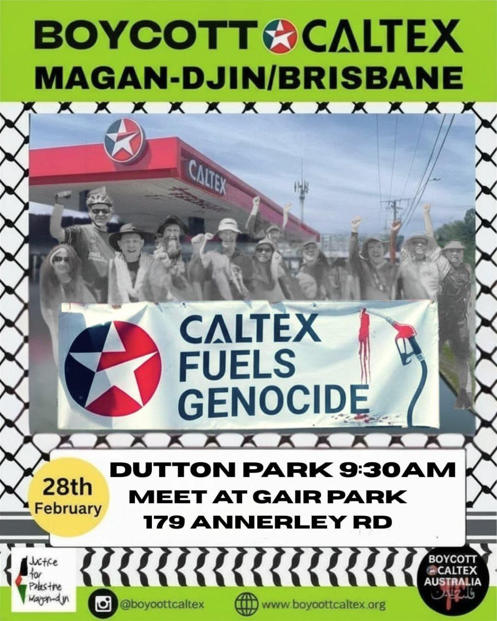 Join us on these stolen lands of the Yuggera and Turrbal people on Saturday 28th February at 9.30am to protest Caltex/Chevron’s continued supply of fuel to the genocide.