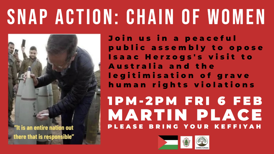 Join the Coalition of Women for Justice and Peace to form a Chain of Women rejecting and opposing Isaac Herzog’s visit to Australia.