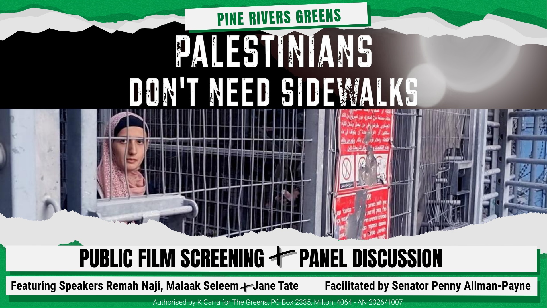 The Pine Rivers Greens would love to see you at Everton Park Library on Saturday, 21 March! We will screen the amazing documentary film Palestinians Don't Need Sidewalks, and then hear from a fantastic panel led by Senator Penny Allman-Payne.