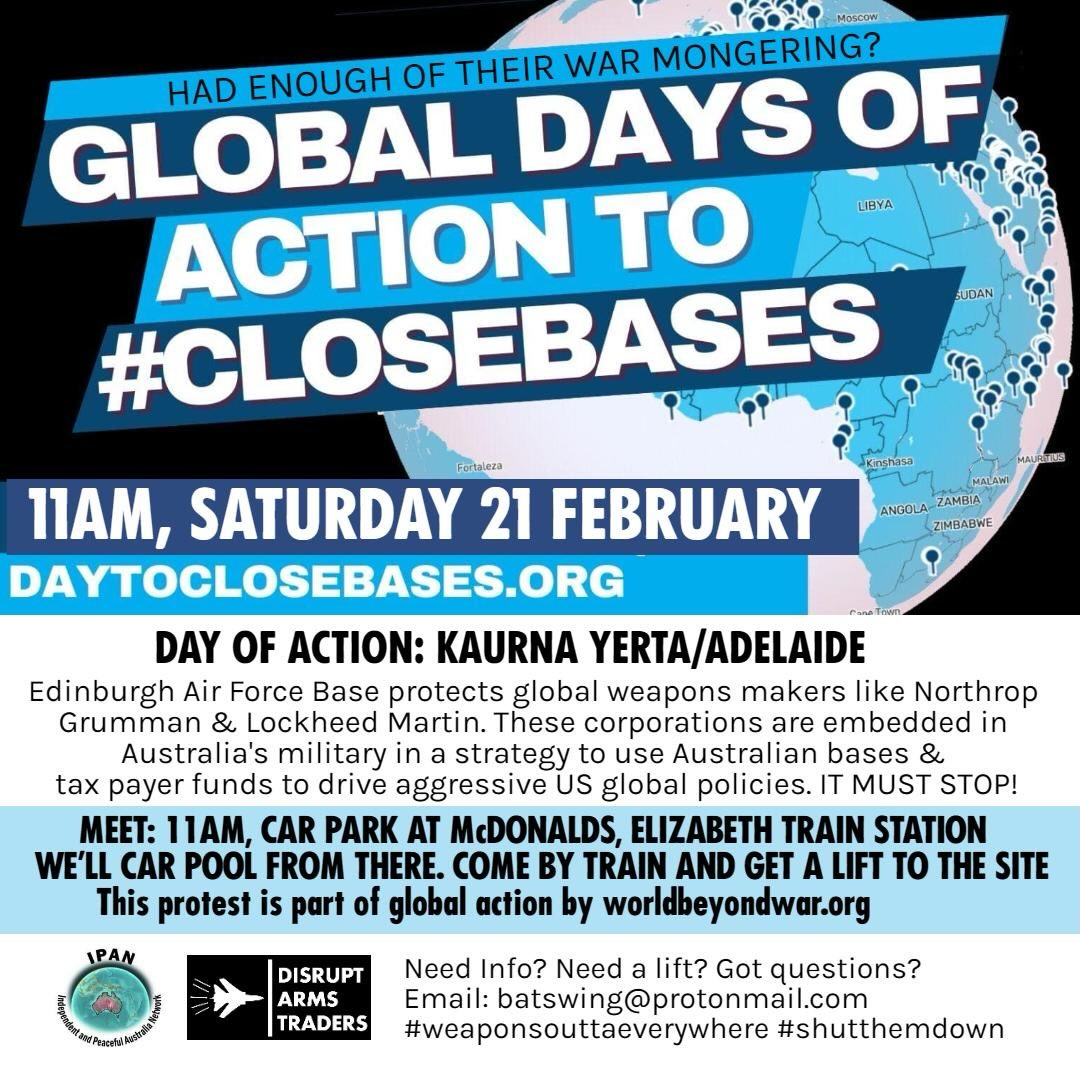 On 21st February we will be protesting at the Edinburgh Air Force Base. Global arms dealers have established themselves inside the Base, under the protection of the Australian Defence Force. Northrop Grumman, Lockheed Martin, BAE Systems, Raytheon, Airbus and others operate weapons programs.