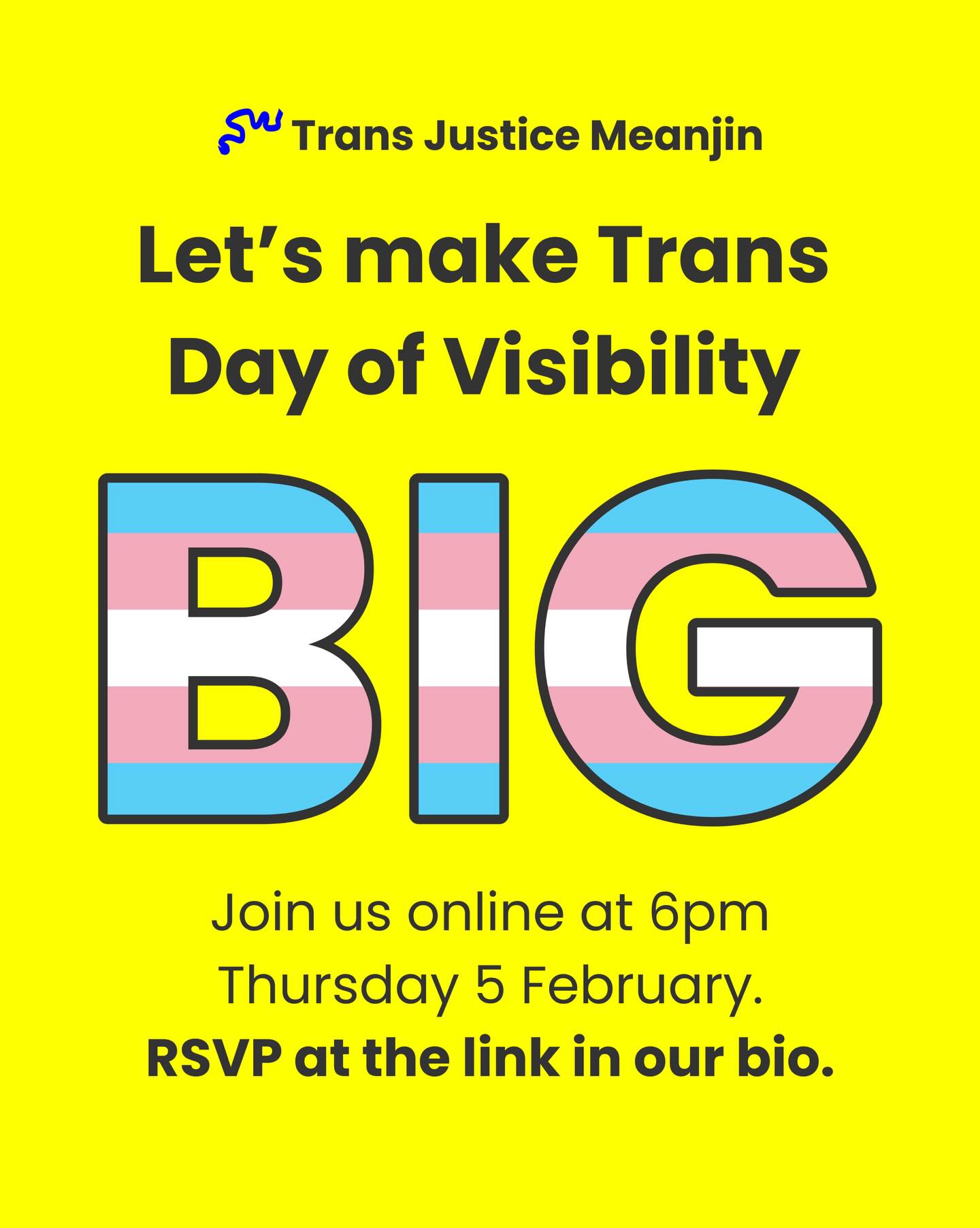 Join us at online at 6pm Thursday 5 February to meet other people passionate about trans justice and help with our plans to make Trans Day of Visibility BIG!