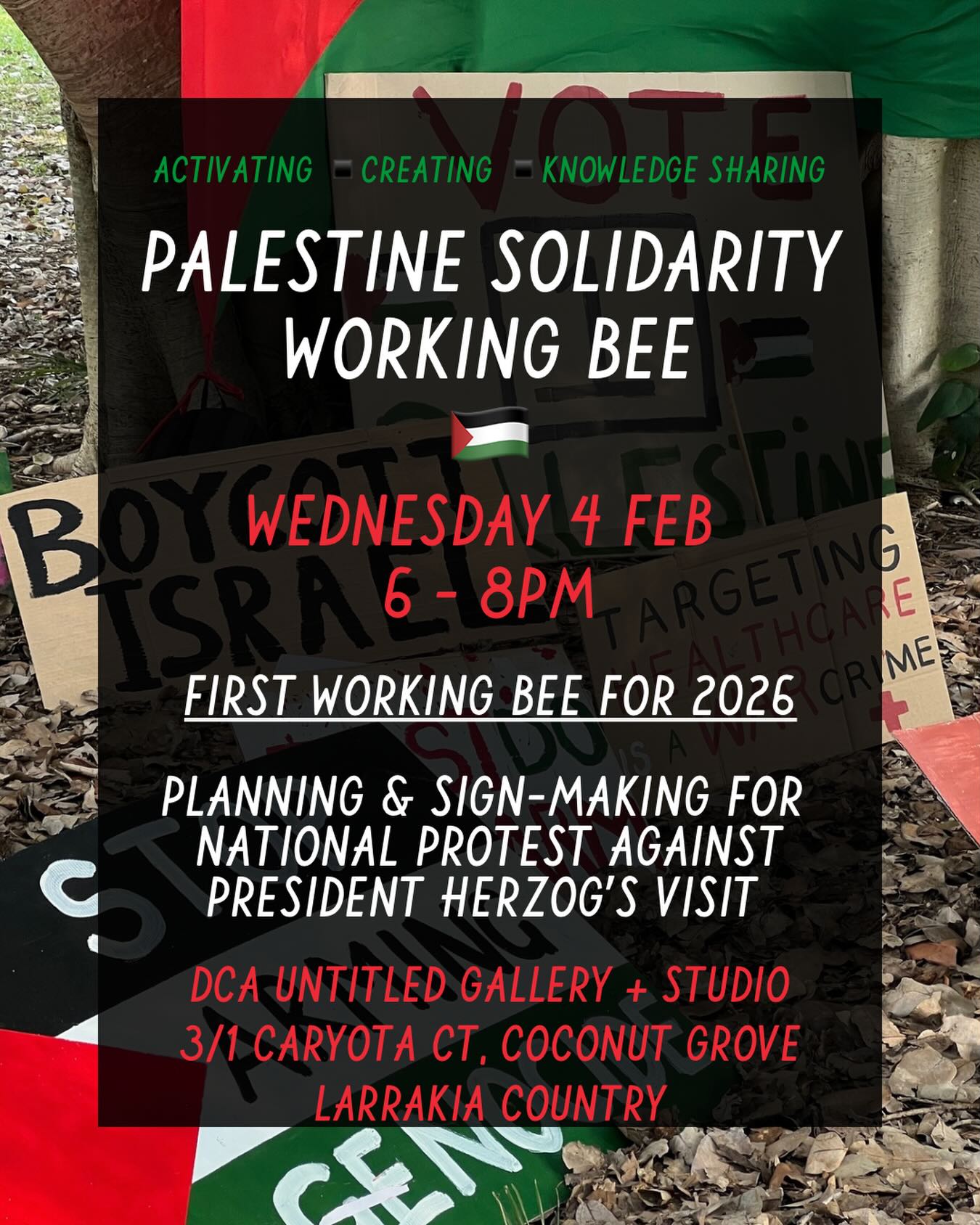 We’ll be planning and making signs for the upcoming national protest against ‘israeli’ President Herzog’s visit to so-called ‘australia’.