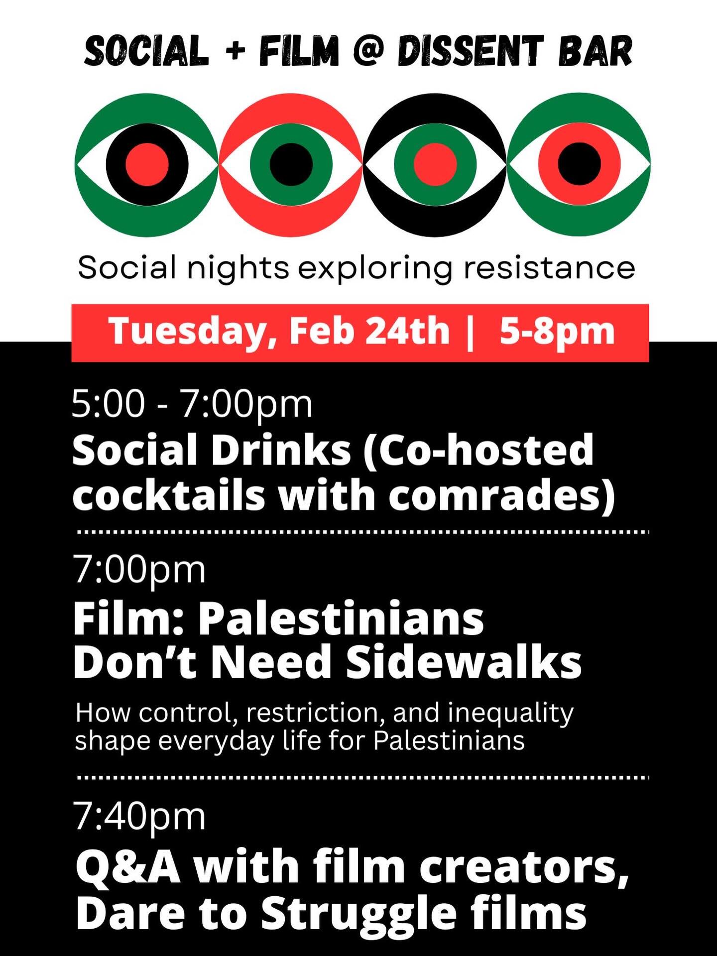 We’ll be screening Palestinians Don’t Need Sidewalks — a powerful look at how control and restriction shape everyday Palestinian life — followed by a Q&A with the filmmakers from Dare to Struggle Films.