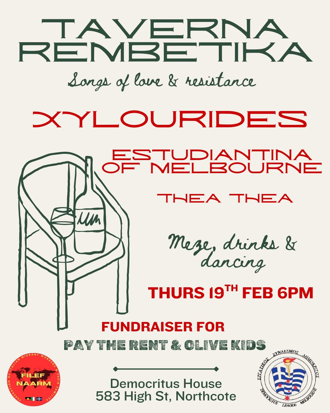Songs of Love and Resistance, with special guests: Xylourides, Estudiantina of Melbourne and Thea Thea. Fundraiser for Pay the Rent and Olive Kids.