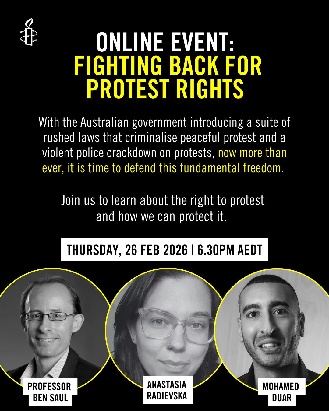 You’ll l hear from expert speakers including Professor Ben Saul, United Nations Special Rapporteur on Human Rights and Counter-Terrorism, Anastasia Radievska, Protest Rights Campaigner at the Australian Democracy Network and Mohamed Duar, Amnesty International Australia Occupied Palestinian Territory Spokesperson on the threats we face to peaceful protest - and how you can be a part of the fight back.