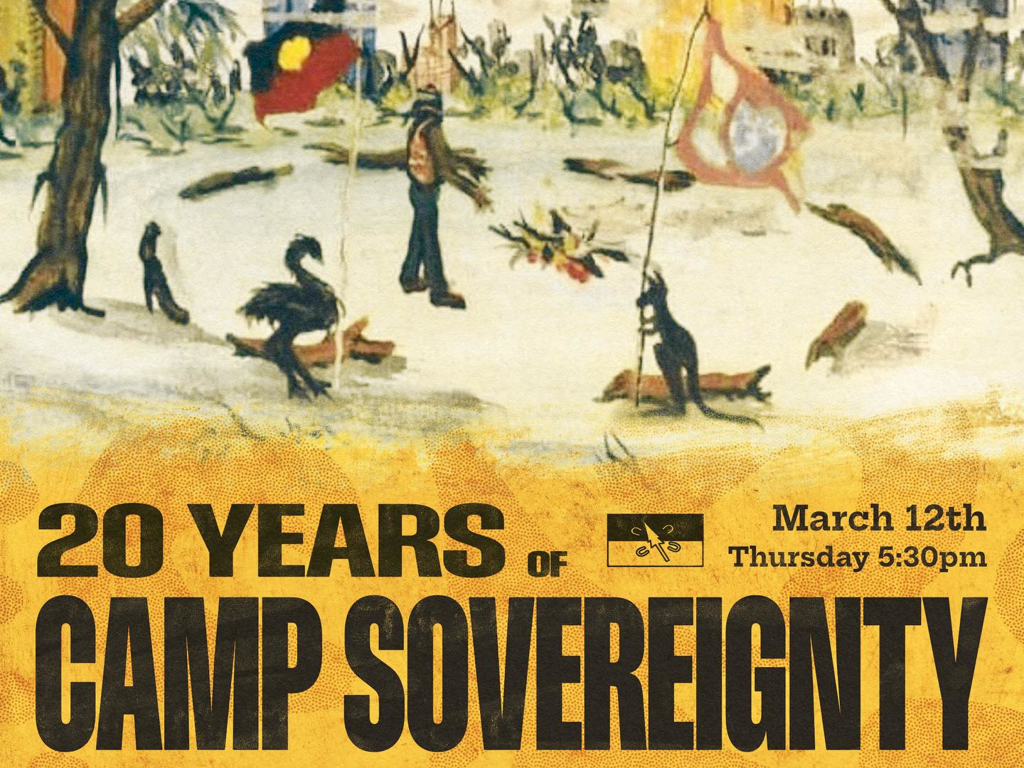 Come to Camp Sovereignty on the 12th of March for the 20th anniversary celebrations. Join us in celebrating and reflecting on the history of the Black GST and Camp Sovereignty Movement. We will have music, food and education resources available.