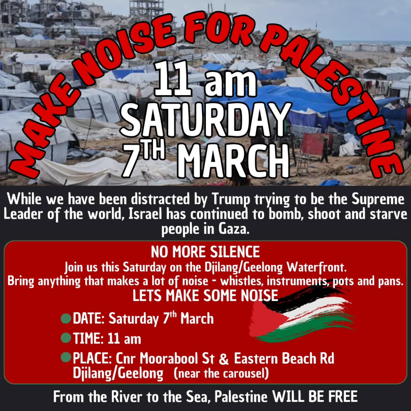 Join us this Saturday on the Djilang/Geelong Waterfront. Bring anything that makes a lot of noise. Whistles, instruments, pots & pans.