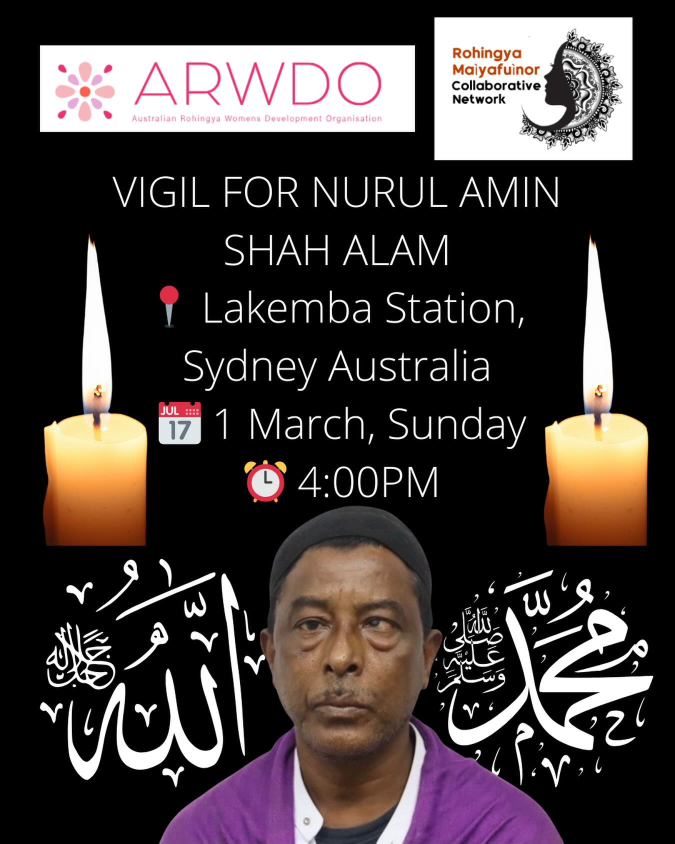 Rohingya Maìyafuìnor Collaborative Network (RMCN) and the Australian Rohingya Women’s Development Organisation would like to invite you all to join us for a vigil in honour of Nurul Amin Shah Alam.