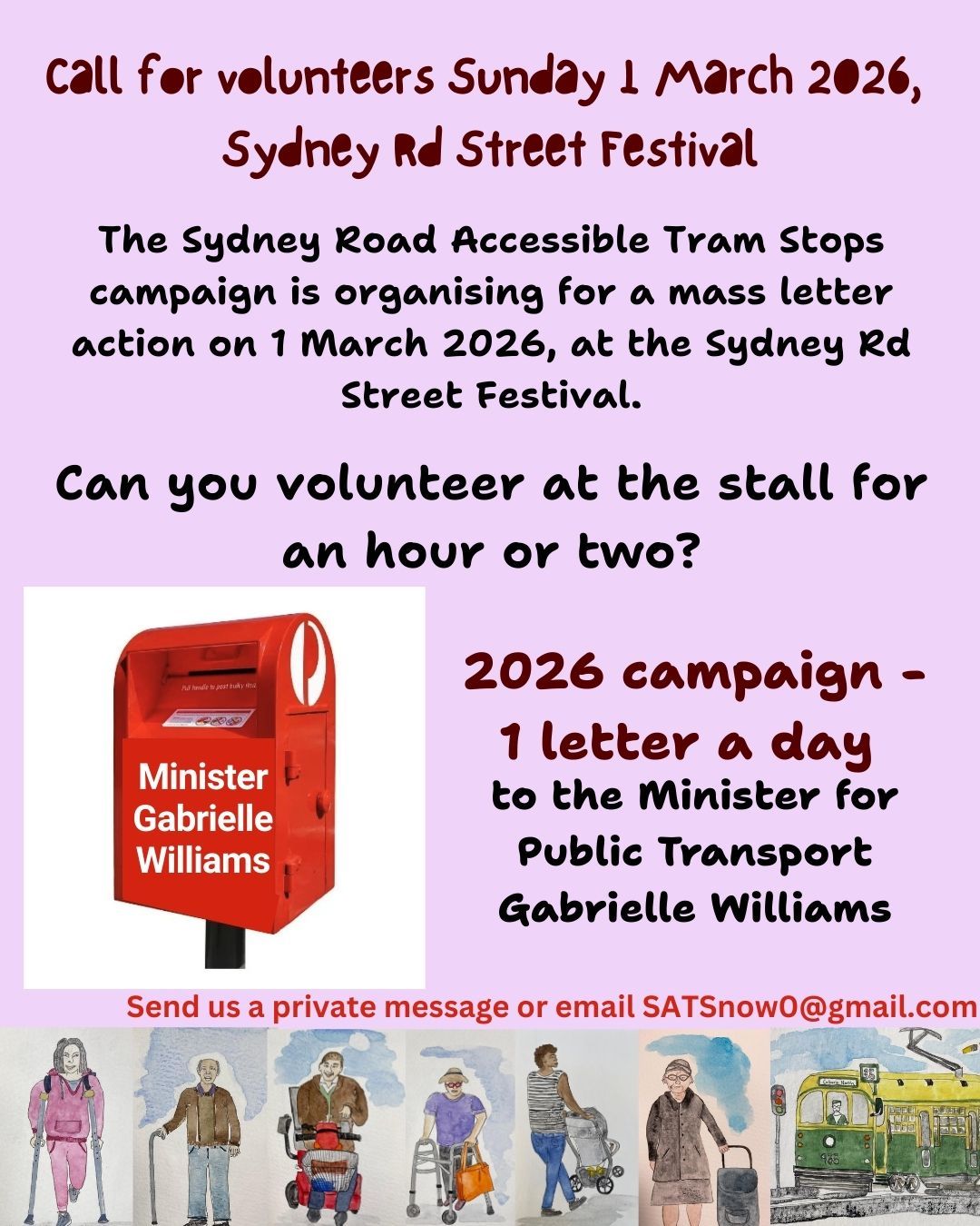We are looking for volunteers to support’s SATS campaign at the Sydney Road Street Party on the 1st of March where we are going to have a stall. Please contact [email protected] if you can help.