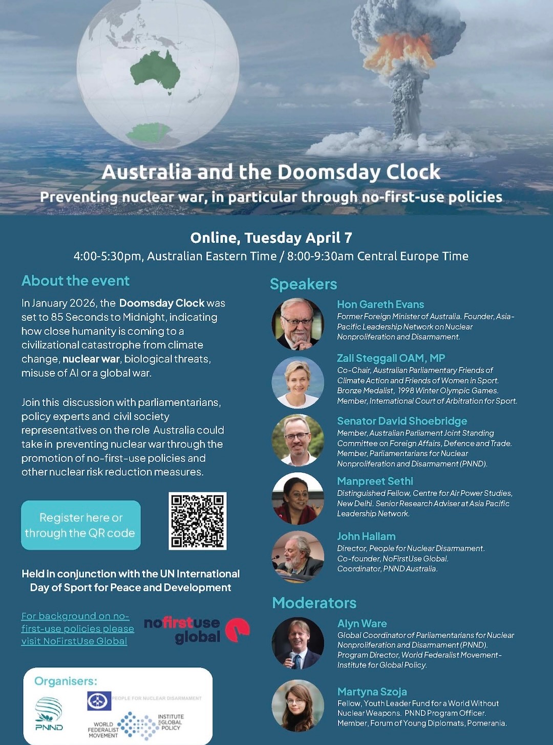 Adoption of No-First-Use (NFU) policies would be one important step. The upcoming Review Conference of the States Parties to the Nuclear Non-proliferation Treaty (April 27 – May 22, 2026) provides an opportunity for Australia to join like-minded countries and civil society in advancing such nuclear risk reduction measures.