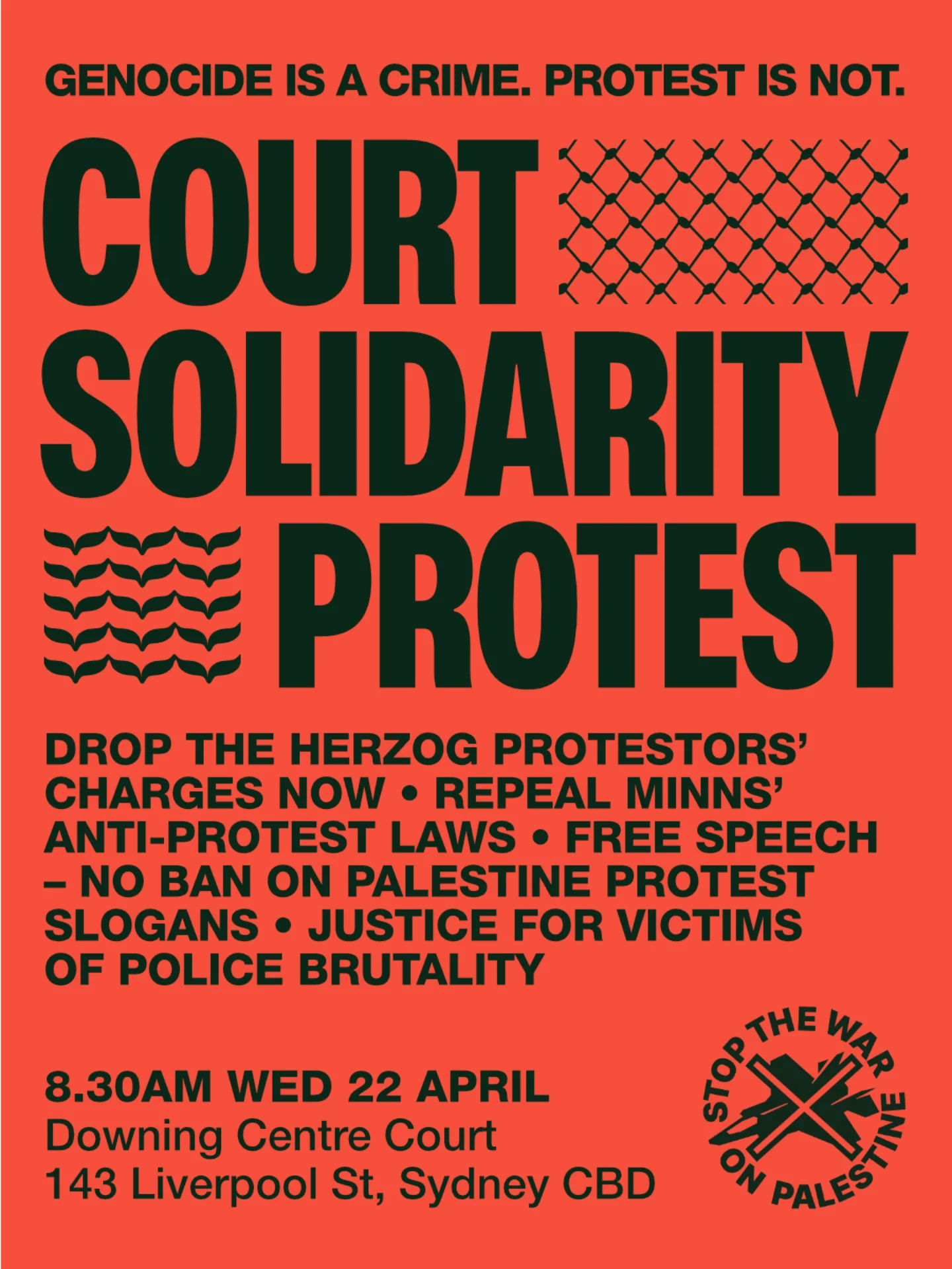 We will rally outside Downing Centre Court to stand in solidarity with all those facing this campaign of repression and call for Minns' anti-protest laws to be scrapped and the charges against protestors dropped.