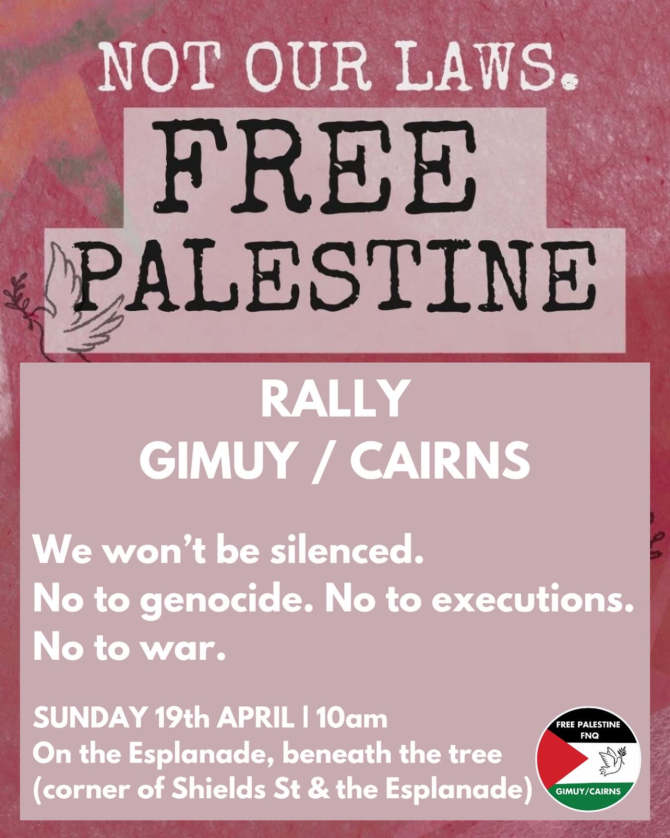 Join us on Sunday 19th of April at the Esplanade (corner of Shields St) at 10am to take part in Not Our Law - Weekend of Action in Gimuy in opposition to these new laws banning pro-Palestine speech.