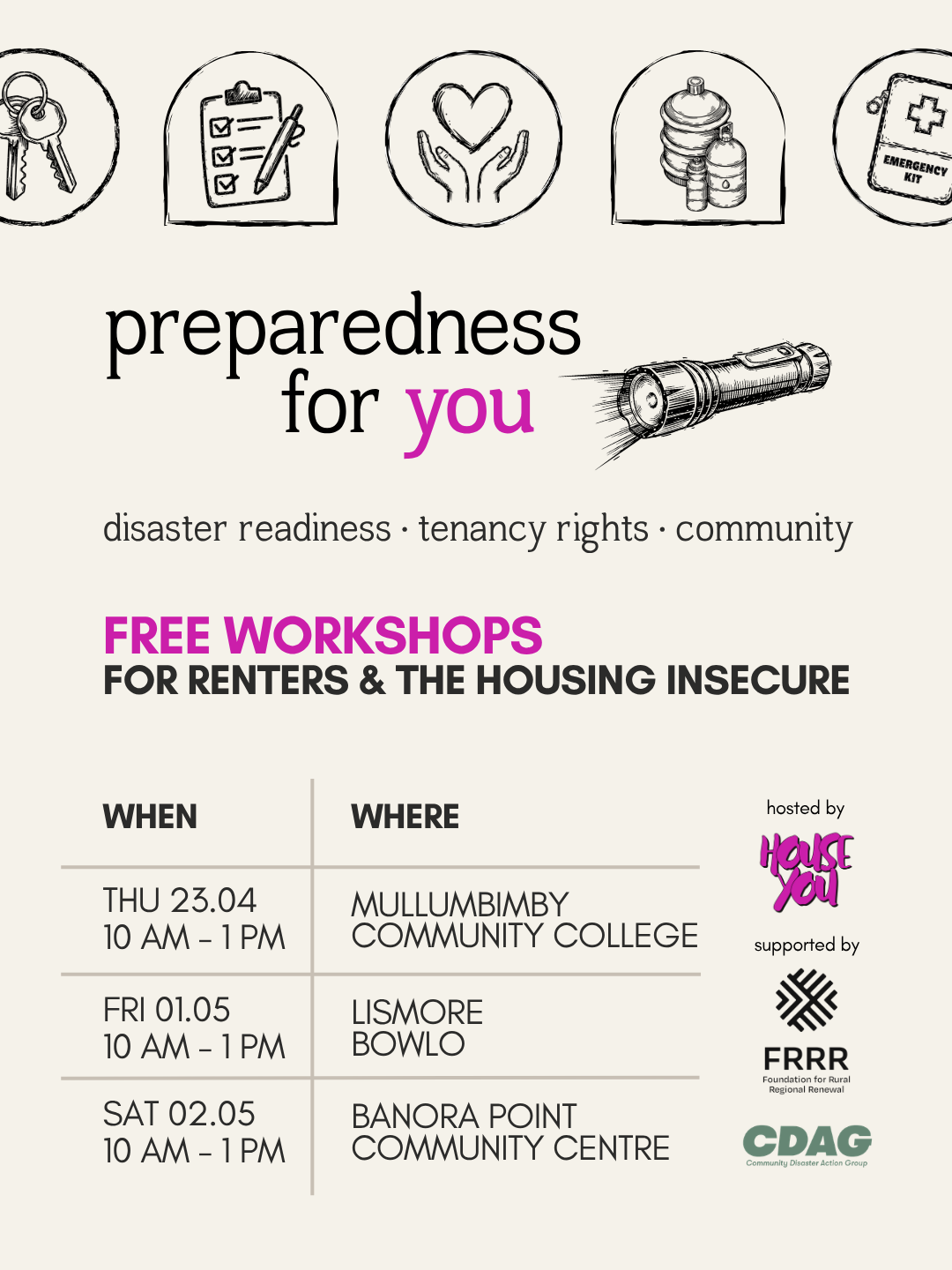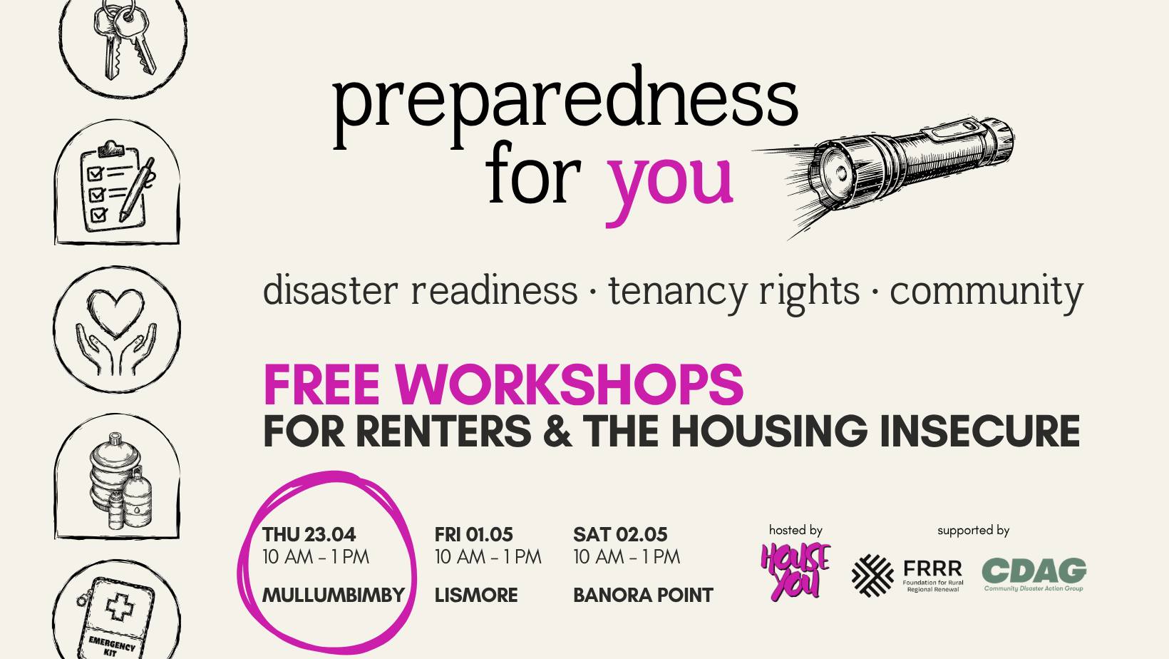 Preparedness for You is a free, three-hour workshop built specifically for renters, unhoused people, and anyone navigating housing insecurity in the Northern Rivers. We’ll work through what disaster preparedness actually looks like when you don’t own your home, and what your rights are when disaster strikes.