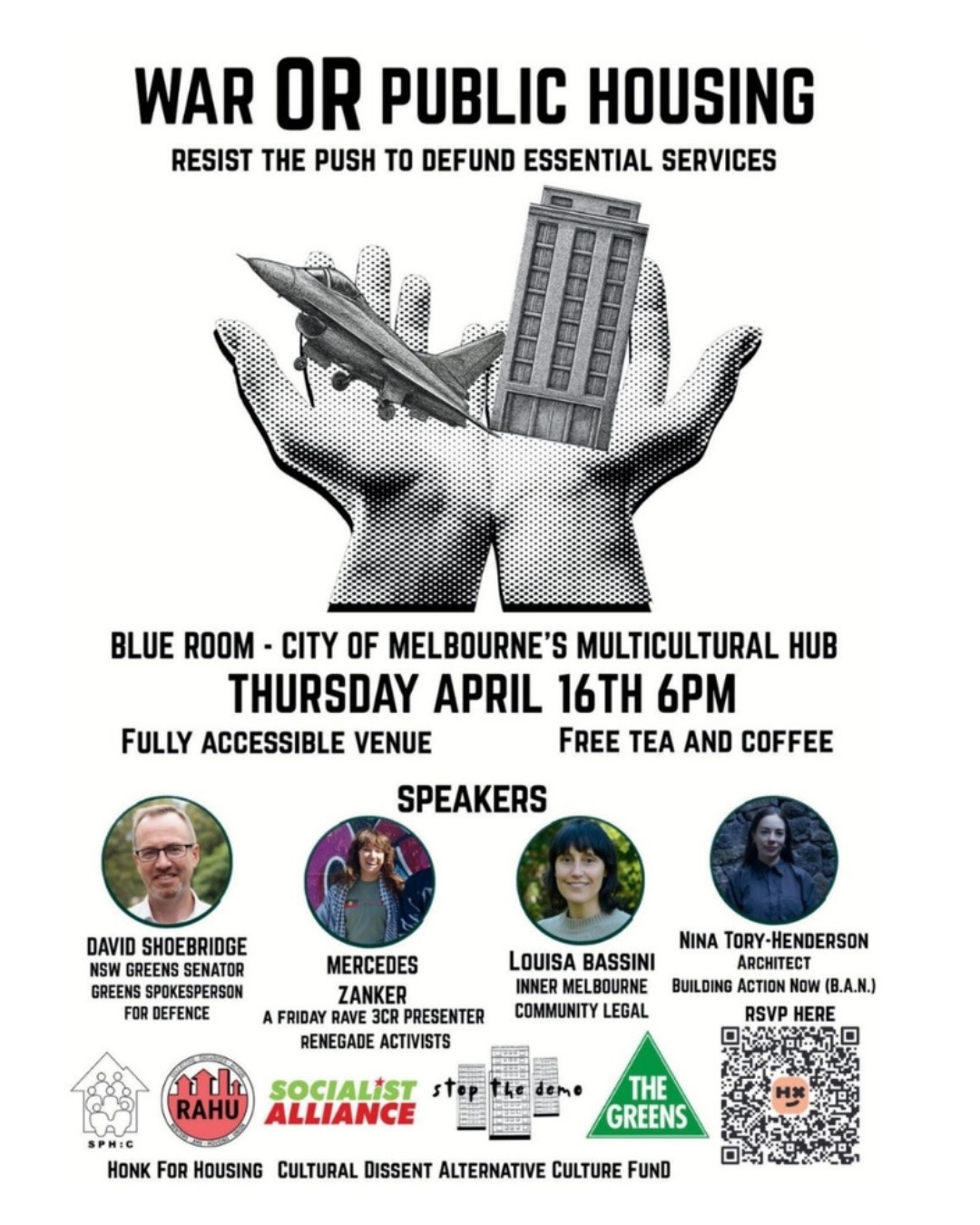 The increasing militarisation and drive to war around the world is taking public money away from essential government spending on things like public housing, education, aged care, childcare and health.
