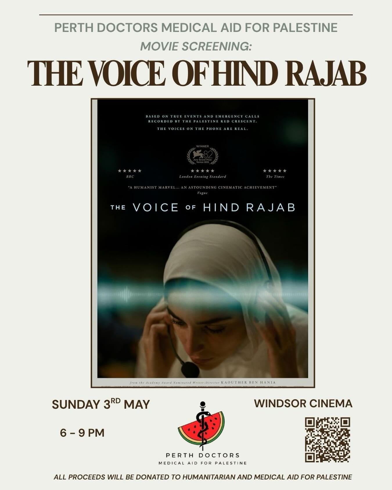 Join Perth Doctors Medical Aid for Palestine to view the Oscar nominated powerful film "The Voice of Hind Rajab". The Voice of Hind Rajab premiered in the 2025 Venice Film Festival, where it broke the record for longest standing ovation, and picked up the Grand Jury Prize. It was also nominated for Best International Feature Film at the 2026 Academy Awards.