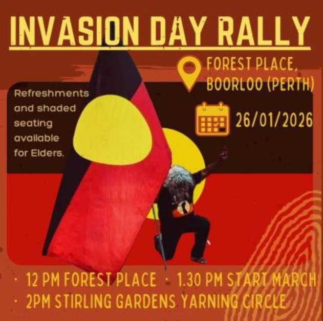 The Noongar elders, who are helping organise the Invasion Day rally, urged everyone to come to Forrest Place, Boorloo, 12 noon. The march to Stirling Gardens starts at 1.30pm where there will be yarning circles.