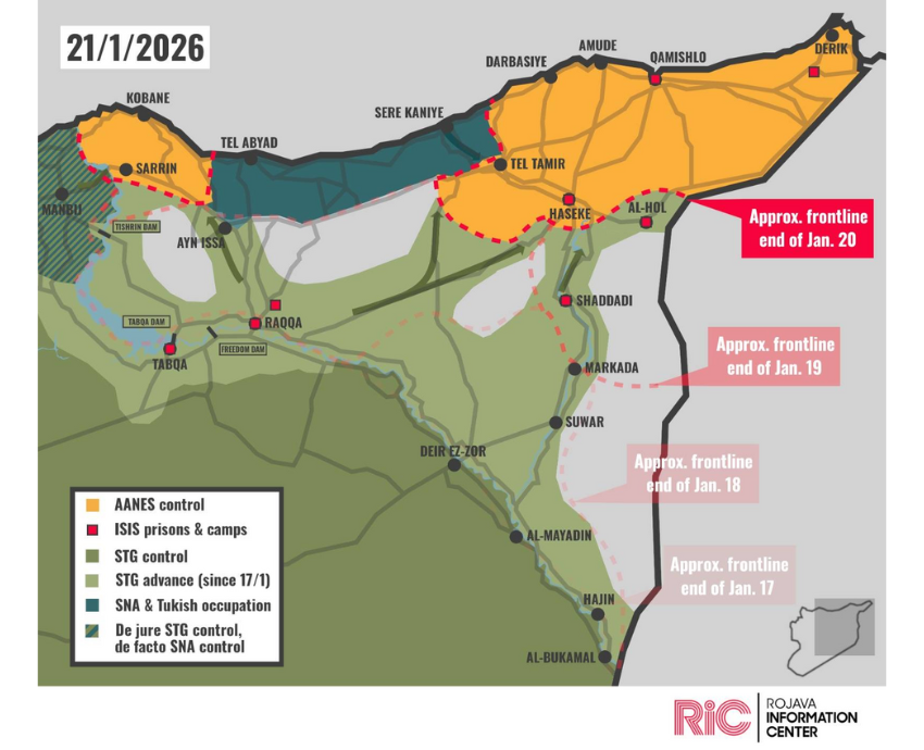 Despite internet disruption Commander Nisrin Abdullah of the Women’s Protection Units (YPJ) held a press conference on January 22 from Kobanê. In 2014, the battle of Kobanê was heralded as a modern Stalingrad — a vital victory against great odds. She was there in 2014 and later active in international diplomacy on behalf of Rojava, even visiting the Elysée Palace. Now, in her words, the Syrian Interim Government is “reestablishing the Islamic State”; and this time, international doors have been closed to the Kurds, so that “the siege today is even more dangerous’’ than it was 11 years ago.
