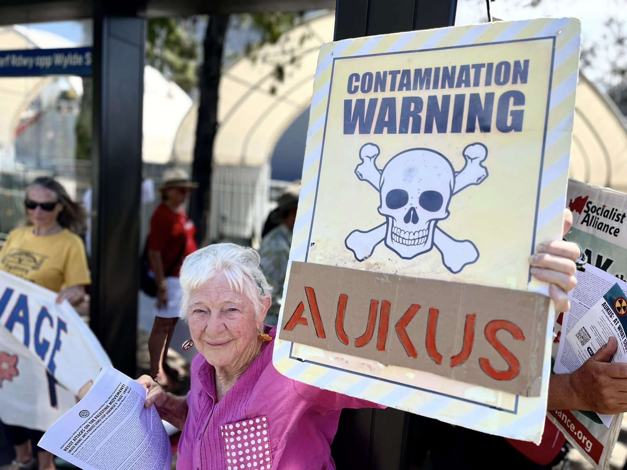 Pip Hinman from Sydney Anti-AUKUS Coalition, kicked off the protest saying: “Today, it’s a radical idea that there could even be a world with no war or threat of war. But it’s what most ordinary people hope for and it’s an idea we need to keep prosecuting and organising to deliver.”