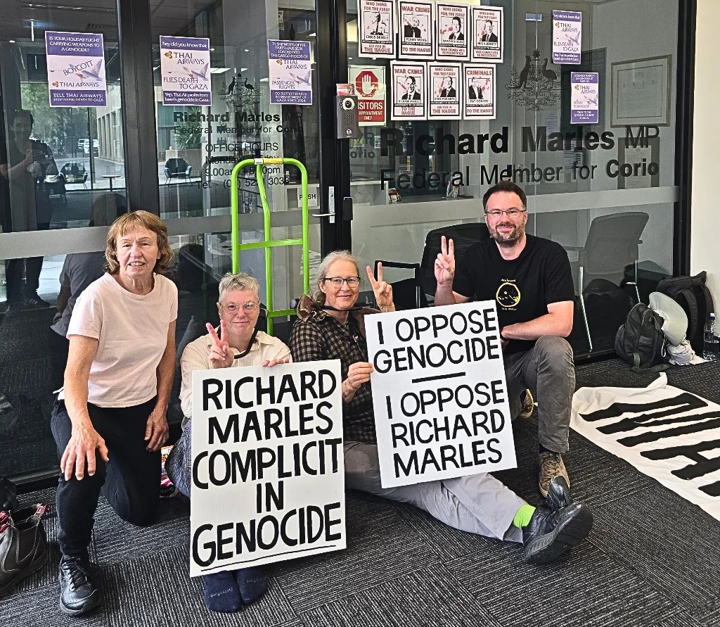 Activists from Defend Peace Djilang took action inside Defence Minister Richard Marles’ electoral office on February 25 calling on him to stop approving export permits of F35 parts to Israel.
