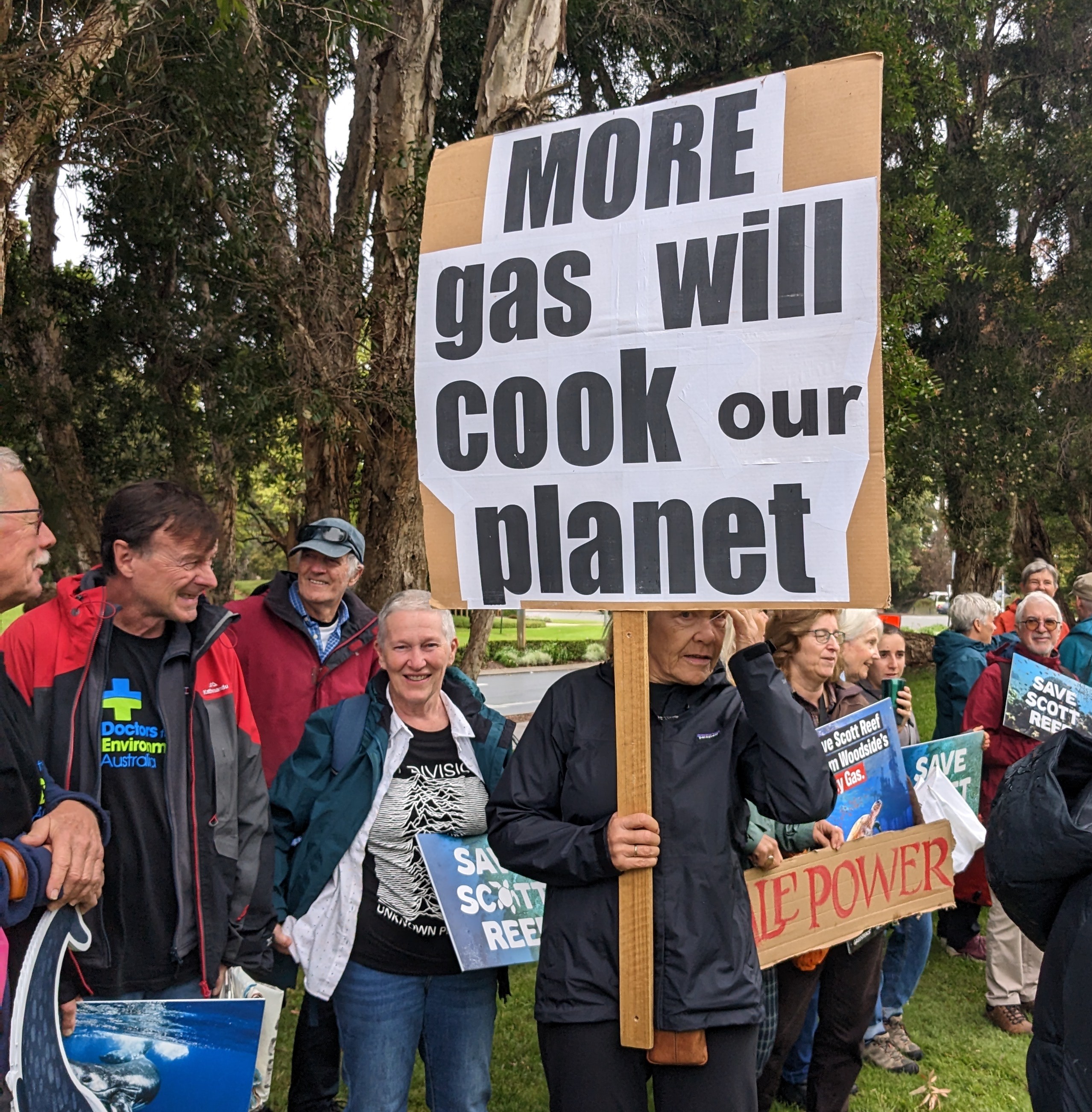 The rally also heard from Get Off My Chest campaigner Clare Lagan, a staunch Freo Dockers fan who is determined to end Woodside’s sponsorship of the Dockers, and Voices for Climate Choir which have helped campaign for an end to Woodside’s sponsorship of the WA Museum.