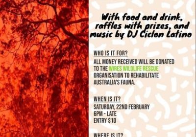 Bushfire fundraiser Magan-djin/Brisbane With food, drink, raffles, and music by DJ Ciclon Latino. The Spanish Centre, 244 Mortimer Rd, Acacia Ridge All proceeds to WIRES Wildlife Rescue