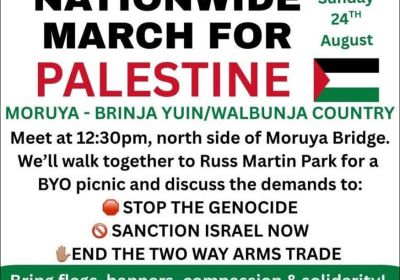 Nationwide March for Palestine – Moruya – Brinja Yuin/Walbunja Country Regional NSW Eurobodalla Justice for Palestine are organising a bridge walk in Moruya on Sunday 24th August to join the nationwide day of action.