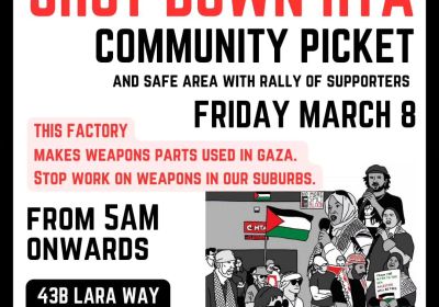 For the past five weeks straight, we have organised rallies that have resulted in the closure of work at a weapons manufacturing factory in Campbellfield. However, this week HTA has resumed work during our protest day. As a community we have decided that to shut down HTA, we will put together a peaceful community picket of work at the factory…