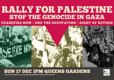 Stand with us this Sunday, on these stolen lands of the Yuggera and Turrbal people, to call across the seas to the stolen lands of the Palestinian people, FREE PALESTINE!