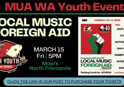 Join the MUA WA Branch Youth who are hosting a night of music, unity, and support at Local Music Foreign Aid, which is a charity event ! Coming together to raise funds for APHEDA and make a positive impact on the world. With an incredible line-up of talented local musicians who are generously donating their time and talent to support this meaningful cause.