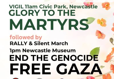 1. Event 1 , 11am Civic Park, Newcastle. Vigil where we will open and observe banners that list the names of Palestinian martyrs. Please bring flowers, leaves, bark, etc. to symbolize an offering. We will also share some thoughts, words, and poetry.