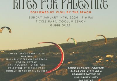 Vigil for Palestine: Sunshine Coast Regional QLD We invite you and your family to FLY your kite to show solidarity with Palestine. This is a family friendly event all are welcome. We will be holding a vigil after flying as a demonstration of solidarity and respect for Palestinians.