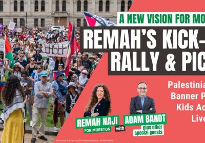 A new vision for Moreton - Remah's kick off rally and picnic Queensland Magan-djin/Brisbane Join Greens candidate for Moreton, Remah Naji, and Australian Greens leader Adam Bandt and other community leaders, for a family-friendly celebration of grassroots power - with Palestinian food, sports, and live music.