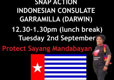 Snap action: Protect Sayang Mandabayan, Protect political freedom in West Papua Garramilla/Darwin Protests in Sorong on the 27th of August 2025 against four political prisoners being tortured and transferred to South Sulawesi were met with brutal police violence and mass detentions.