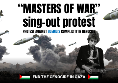 The protest will involve multiple renditions of Bob Dylan's "Masters of War" to protest Boeing's complicity in the genocide in Gaza and the West Bank.