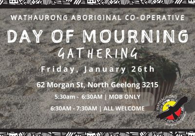 Day of Mourning Dawn Service Djilang/Geelong Wathaurong Aboriginal Co-operative will be hosting a dawn service to commemorate a Day of Mourning. 5:30 - 6:30am mob only. Community from 6:30 - 7:30am
