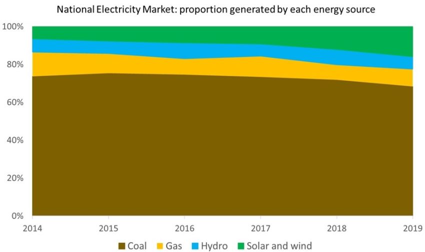 Figure 3 below shows how much electricity has come from different sources over the past six years. Generation is still dominated by coal, and this dropped only slightly. Australia has a long way to go to achieve 100% renewable energy.