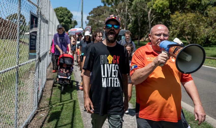 About 100 people gathered in nearby Maroubra and marched to the front of the complex, chanting: “Always was, always will be, Aboriginal land!”