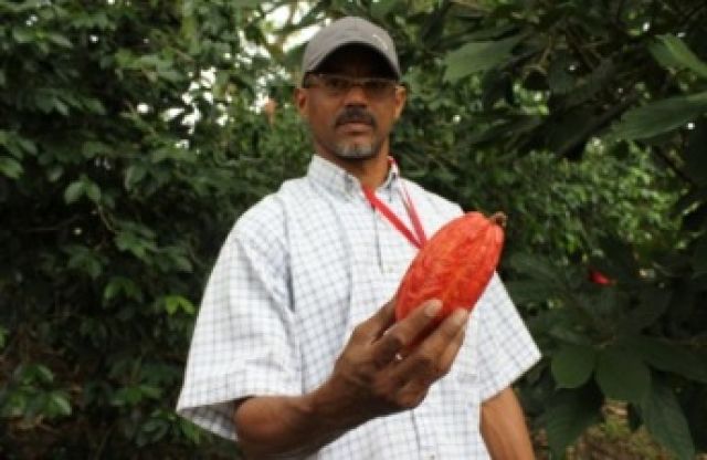 A grower holds a cocoa pod on a community owned plantation in Venezuela.