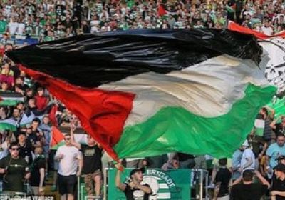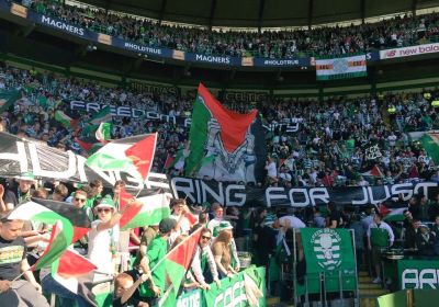 Members of Celtic’s “ultras” fan group, the Green Brigade, along with Celtic Fans for Palestine, lifted a huge Palestinian flag, as well as large banners with the slogans “Freedom and Dignity” and “Hungering for Justice”.